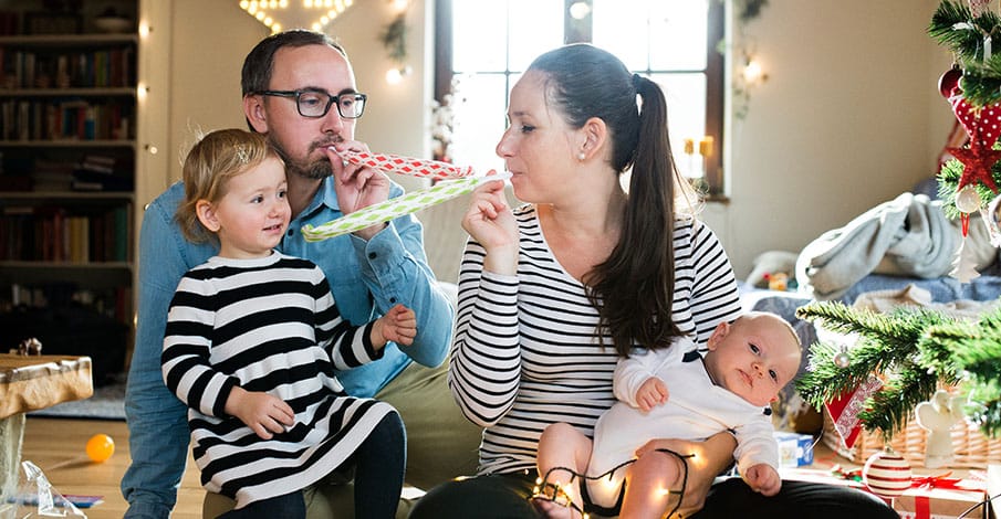 Parents with children at Christmas tree blowing party whistles Leave a Comment / By admin / April 9, 2018